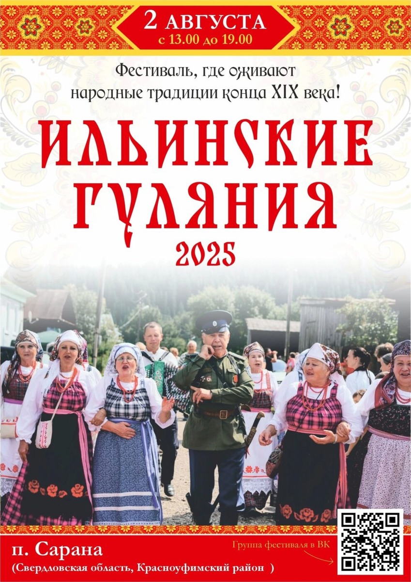 Глава Красноуфимского района, Олег Викторович Ряписов, подписал постановление о проведении фестиваля реконструкции культуры и быта конца 19 века – «Ильинские гуляния». В основе фестиваля – праздник аграрного народного календаря, знаменующий поворот от лета к осени. «Ильинские гуляния» – это погружение в атмосферу народных гуляний, какими они были 150 лет назад: без сцен, микрофонов и коммерческих развлечений. ПРИГЛАШАЮТСЯ К УЧАСТИЮ: Подать заявки можно по тел. +7 996 182-90-72. География участников впечатляет: к нам едут из Удмуртии, Тюмени, Уфы, Мечетлинского и Дуванского районов, Баймака, Бирска, Новоуральска, Первоуральска, Нижнего Тагила, Арамиля, Краснотурьинска, Серова, Невьянска, Ревды, Екатеринбурга, Перми, Красноуфимска, Шалинского, Ачитского, Артинского, Нижнесергинского и Красноуфимского районов, поселков Суксун и Белоярский. Источник: ksk66.ru