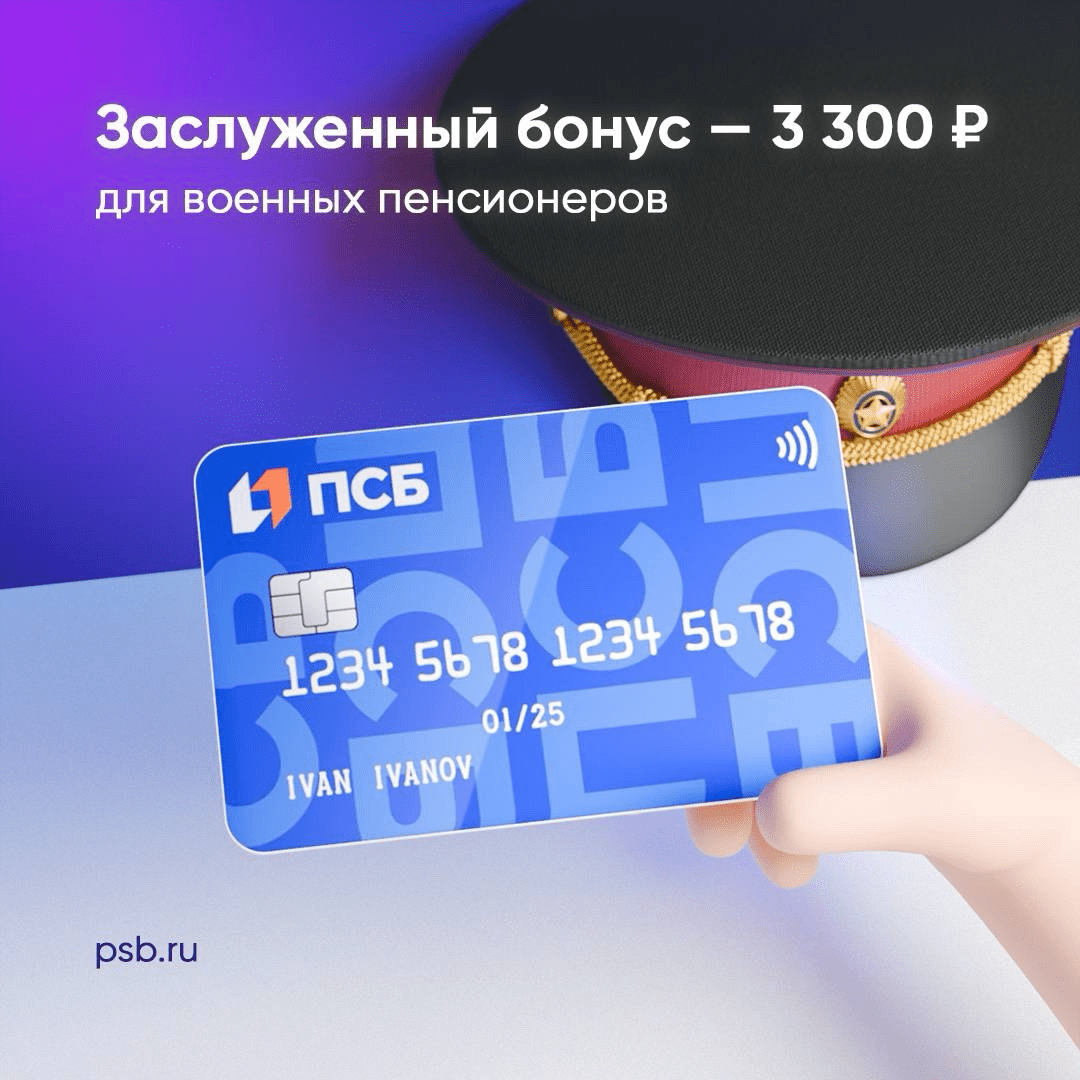 ПСБ запустил акцию «Заслуженный бонус»* для военных пенсионеров, получающих пенсионные выплаты от силовых и оборонных ведомств. В рамках акции ПСБ разово начислит 3 300 рублей военным пенсионерам, впервые получившим до 31 декабря 2025 года выплату пенсии на дебетовые карты “Твой кешбэк” или “Твой кешбэк для военнослужащих”, карту для пенсионеров силовых структур и ветеранов боевых действий или на многофункциональную карту-электронное удостоверение «СВОи» от ПСБ. Платежные карты ПСБ открывают доступ к широкому спектру финансовых сервисов – операции с наличными в разветвленной сети банкоматов, моментальная оплата товаров и услуг, безопасные быстрые платежи и переводы. Карта СВОи также обеспечивает быстрый и простой доступ к любым государственным социальным льготам по всей России. Для участия в акции достаточно заполнить заявку в специальном разделе на официальном сайте ПСБ либо позвонить на горячую линию банка. Военные пенсионеры также могут автоматически перейти в раздел акции, отск