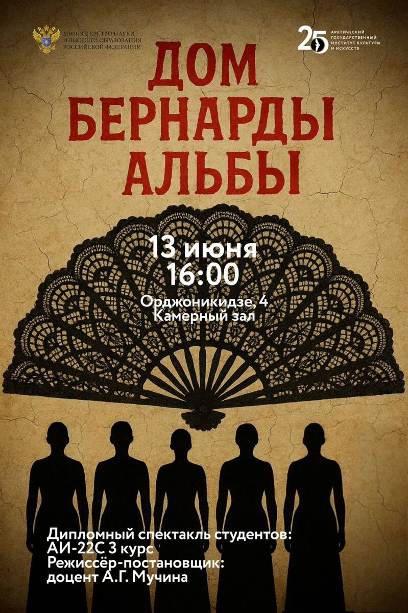Арктический государственный институт культуры и искусств приглашает зрителей на театральную постановку по знаменитой пьесе Фредерико Гарсиа Лорки «Дом Бернарды Альбы». Режиссером-педагогом выступает заслуженный деятель искусств Республики Саха (Якутия), доцент АГИКИ Александра Мучина.