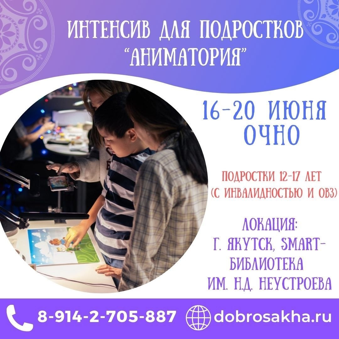 🔲Приглашаем на подростковый интенсив «АниматориЯ»! ❓Хочешь научиться создавать мультфильмы и выступать на публике❓ 🤩Присоединяйся к 5-дневному интенсиву, где подростки будут творить и развиваться! 🔅Что тебя ждёт: 🔸Мастер-классы по анимации: создавай мультфильмы! 🔸Воркшопы по публичным выступлениям: делись своими идеями! 🔸Игры и знакомства: найди друзей с общими интересами! 🔸Творческая атмосфера и поддержка. 🔲Когда и где: 📅Даты: 16-20 июня 🛜Место: SMART-библиотека им. Н.Д. Неустроева 🔲Для подростков 12-17 лет (с инвалидностью и ОВЗ). 🟥Количество мест ограничено. Регистрация обязательна! ✏️Ссылка на регистрацию: https://forms.yandex.ru/u/6846fc68068ff0602bb6f246 📲Телефон «Службы Заботы»: 8914-2-705-887 #ЗаписьХарысхал