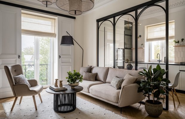 Центральным элементом в гостиной, безусловно, является французский балкончик. Вместо традиционных штор здесь предусмотрены распашные ставни, которые были изготовлены из старых межкомнатных дверей. В реставрационной мастерской их нарастили по высоте, чтобы полностью закрыть световой проем.