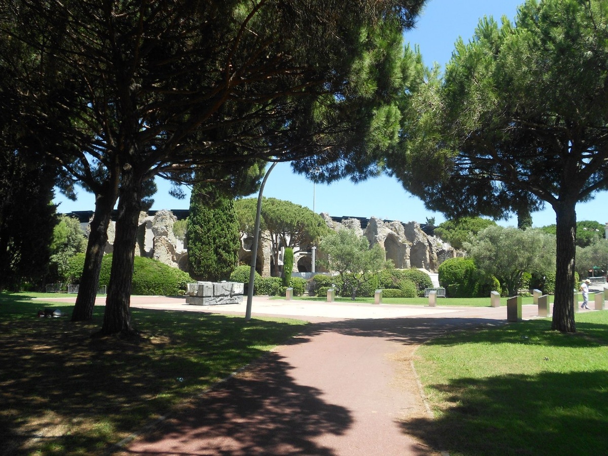 По-французски - Arènes de Fréjus, то есть, арены Фрежюса. Эта конструкция появилась чуть позже римского Колизея, конец 1 в. н.э., и считается одним из древнейших памятников Галлии.