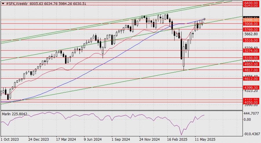 На графике недельного масштаба цена сегодня вышла над линию Крузенштерна, открытие недели произошло над промежуточным уровнем 5998. Осциллятор Марлин растёт бодро.