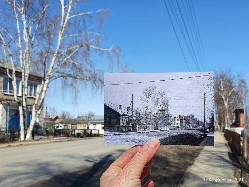 Фото-проект «Взгляд в прошлое». Автор Нина Кнауб. Межпоселенческая библиотека Парабельского района. 📸 На цветном фото - село Парабель, ул. Советская. 📷На черно-белом фото - здание редакции, 1960-е годы. Автор К.П. Деев. #Парабель425лет