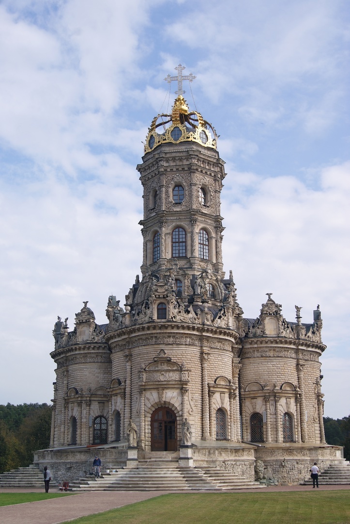 Все, кому я показывала фотографию без, так сказать, предисловия, были единогласны в том, что это фотография какого-то европейского храма. Ну точно не у нас, не в России. А на самом деле это великолепие находится в селе Дубровицы, Подольского района Московской области - Знаменская церковь. Храм настолько необычен, что даже не возможно определить в каком же стиле он построен. Так случилось, что ближайший сподвижник Петра I – князь Борис Александрович Голицын купил село Дубровницы в 1688 году. В те времена в этом селе была лишь деревянная церковь. Да собственно и как такового села не было — была боярская усадьба с избами для дворовых людей. Может быть все так и оставалось бы, даже после приобретения местечка Голицыным, если бы примерно в это же в это время новый собственник не впал в немилость государю. Голицына оклеветали и государь отстранил на некоторое время его от себя. И вот именно в это время Борису Голицину пришла идея построить в новом селе храм в честь Петра. Впрочем. Петр I нед