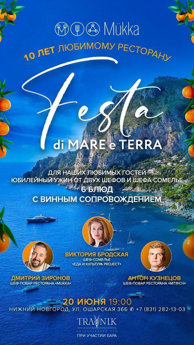 FESTA DI MARE E TERRA 10 лет ресторану Mükka В этом июне ресторан Mükka отмечает свой десятилетний юбилей — и приглашает Вас разделить вечер, наполненный радостью, вкусом и атмосферой настоящей итальянской Festa. ужин "FESTA DI MARE E TERRA" — праздник двух стихий: моря и земли. Символ щедрости, единства контрастов и нашей любви к гостям, которая остаётся неизменной уже 10 лет. Вас ждёт гастрономический сет из шести подач от двух шефов: шеф-повара ресторана "Mukka" Дмитрия Зиронова, шеф-повара ресторана "Mitrich" Антона Кузнецов и винное сопровождение от шеф-сомелье Еда и Культура project Виктории Маркевич, а так же сюрприз от команды бара TRAVNIK, созданный специально для нашего ужина. Всё это — основа вечера, который наполнит сердце теплом и радостью. Тёплый свет гирлянд и живая музыка, наполняющая веранду дыханием южного вечера, создадут вокруг особенную атмосферу. На память — фото в нашей фотозоне, а чуть позже — сюрпризы от команды, подарки от партнёров, розыгрыши и аперитив
