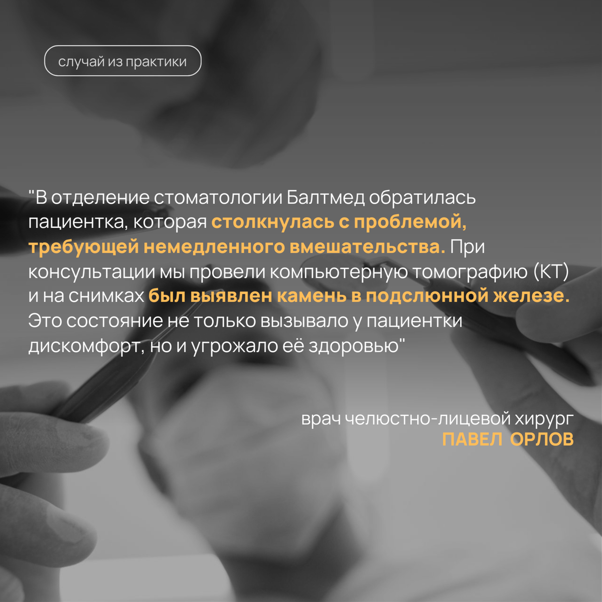 «В отделение стоматологии Балтмед обратилась пациентка, которая столкнулась с проблемой, требующей немедленного вмешательства. При консультации мы провели компьютерную томографию (КТ) и на снимках был выявлен камень в подслюнной железе. Это состояние не только вызывало у пациентки дискомфорт, но и угрожало её здоровью. Пациентка рассказала, что в других клиниках ей предлагали радикальное решение — удаление камня вместе с самой железой. Однако мы решили подойти к ситуации внимательно - мы предложили альтернативный метод лечения, который позволяет сохранить саму железу и избавить пациентку от дискомфорта. В результате консилиума было принято решение провести удаление камня внутриротовым методом. Операция была выполнена под местной анестезией в амбулаторных условиях. Процедура прошла успешно, и пациентка уже сегодня чувствует себя значительно лучше, не испытывая ни болей, ни дискомфорта. Мы рады, что смогли помочь ей сохранить функцию слюнной железы и вернуть уверенность в себе». 📎 Берег