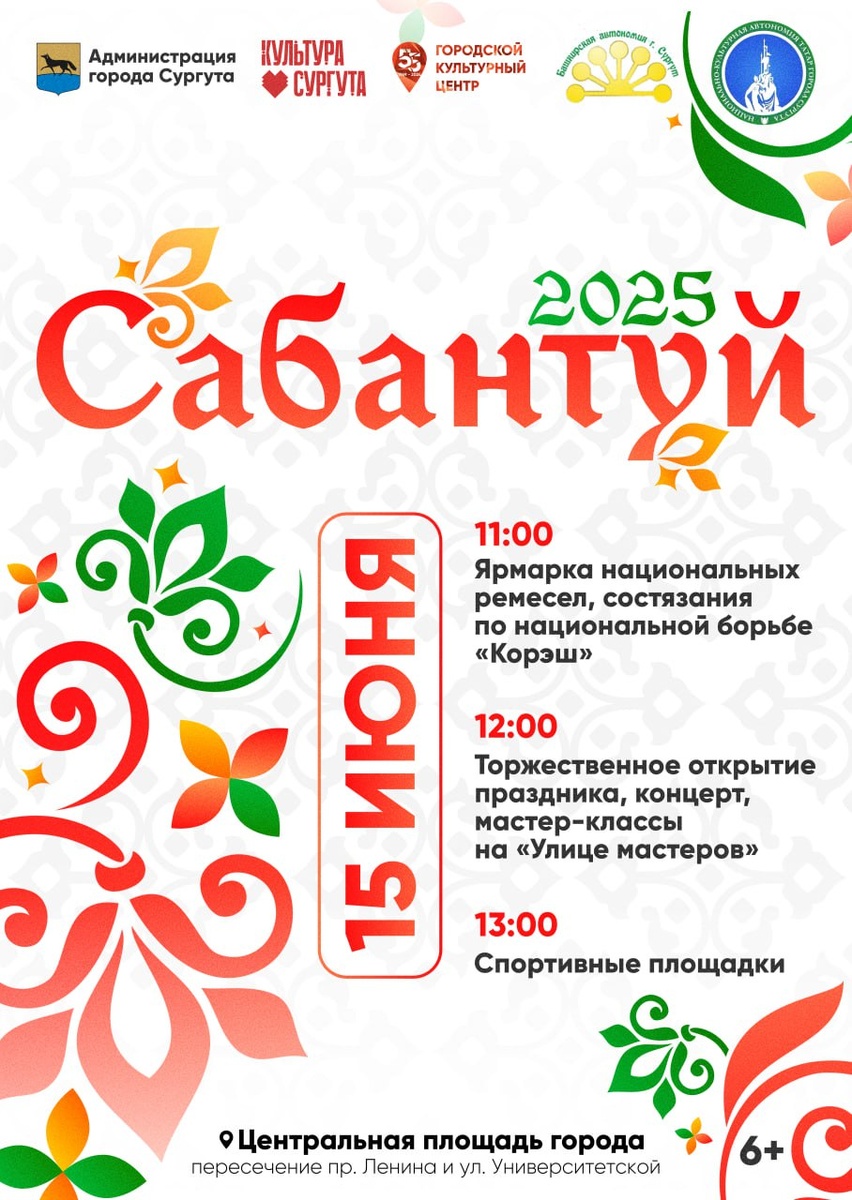 В Сургуте 15 июня с 11 до 16 часов состоится большой городской праздник Сабантуй. На Центральной площади гостей ждут выступления известных артистов из Башкортостана и Татарстана, включая народных артистов Минзифу Искужину, Артура Туктагулова, Равиля Галиева и других. Посетители смогут принять участие в мастер-классах по декоративно-прикладному искусству, национальных играх и стать свидетелями традиционной борьбы «корэш». Организаторами праздника выступили Городской культурный центр при поддержке комитета культуры администрации и национально-культурных автономий татар и башкир Сургута.