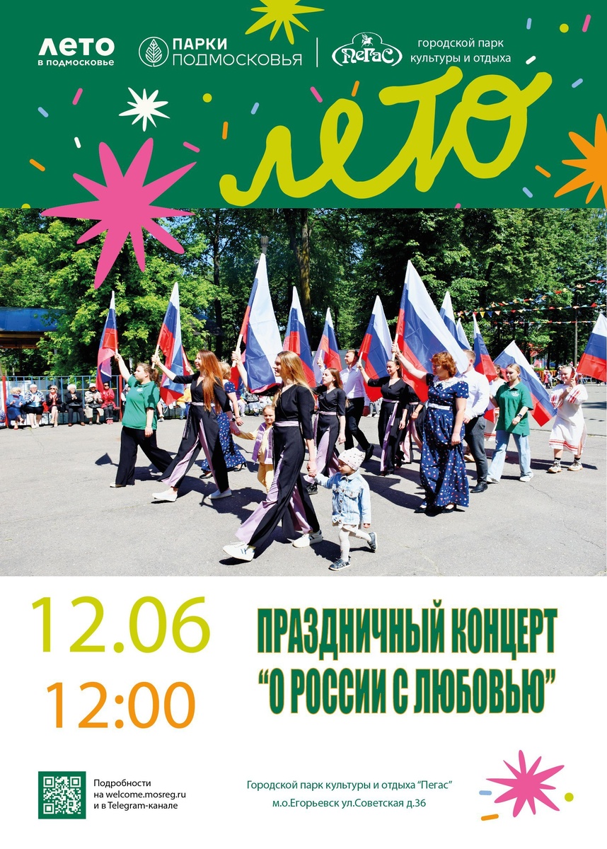 Парк культуры и отдыха "Пегас" приглашает на мероприятия, посвященные Дню России. Дата: 12 июня Начало: 12:00 - 12:00 - праздничный концерт "О России с любовью" - 12:00-13:00 - локация "Аквагрим" - 13:00-13:40 - тематический мастер-класс "Мир глазами детей" - 19:30 - караоке программа - 20:30 - художественный фильм "Мой любимый чемпион" #подмосковье #НашеПодмосковье #муниципальныйокругЕгорьевск #моЕгорьевск #егорьевскоетелевидение #егорьевскоетв #Егорьевск #администрацияегорьевск