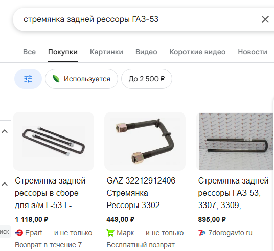Следующим шагом стало подключение фида в Google Merchant. Это случилось позже – уже в 2024 году – но эффект был сравнимо сильным. Особенно хорошо фид сработал по горячим и конкретным товарным запросам. Те, кто искал, к примеру, «Форсунку топливную ВАЗ-1118» или «стремянку задней рессоры ГАЗ-53», попадали в визуальную витрину с изображениями, ценами и рейтингами – и могли выбрать нашего клиента напрямую.
