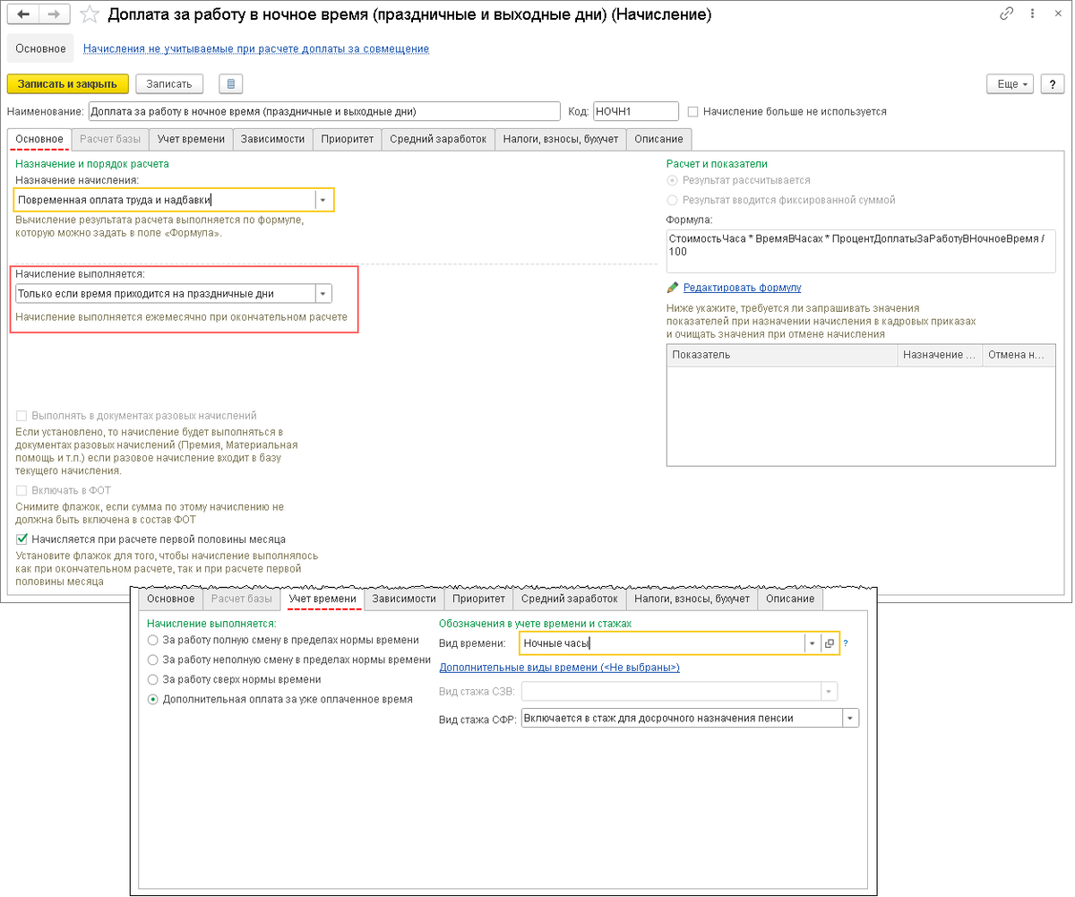 Начисление оплаты за работу в праздничный день в ночное время в программе "1С:ЗУП 8"
