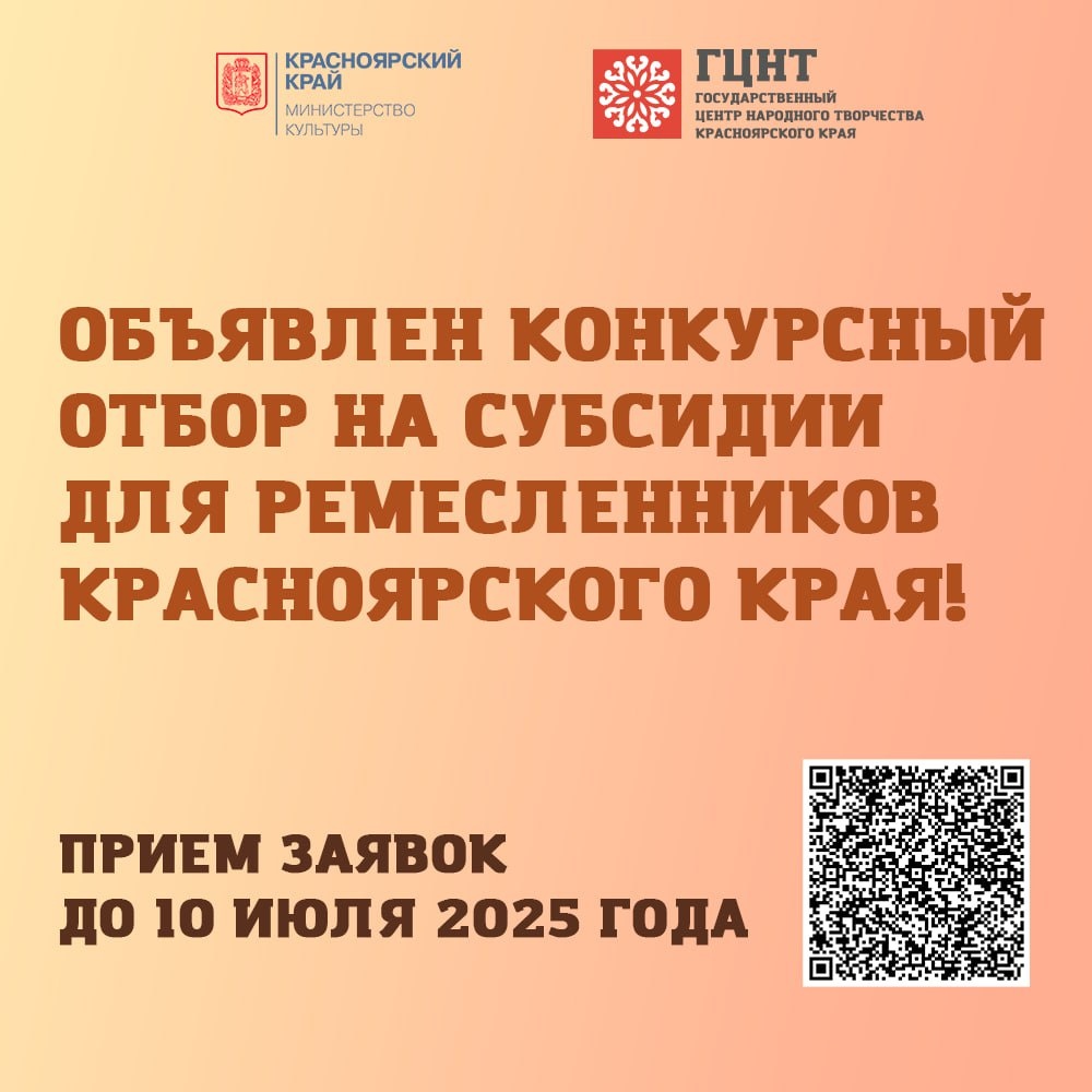 📢 Объявлен конкурсный отбор на субсидии для ремесленников Красноярского края! В 2025 году субсидии предоставляются юридическим лицам, индивидуальным предпринимателям, осуществляющим деятельность в области художественных народных ремёсел Красноярского края, на возмещение затрат, связанных с приобретением специального оборудования, сырья и расходных материалов. Как принять участие? 🗓Заявки подаются через систему «Электронный бюджет» (ГИИС) до 10 июля 2025 года. 👉 Подробности и подача заявки. Не упустите шанс получить поддержку для развития своего ремесла!