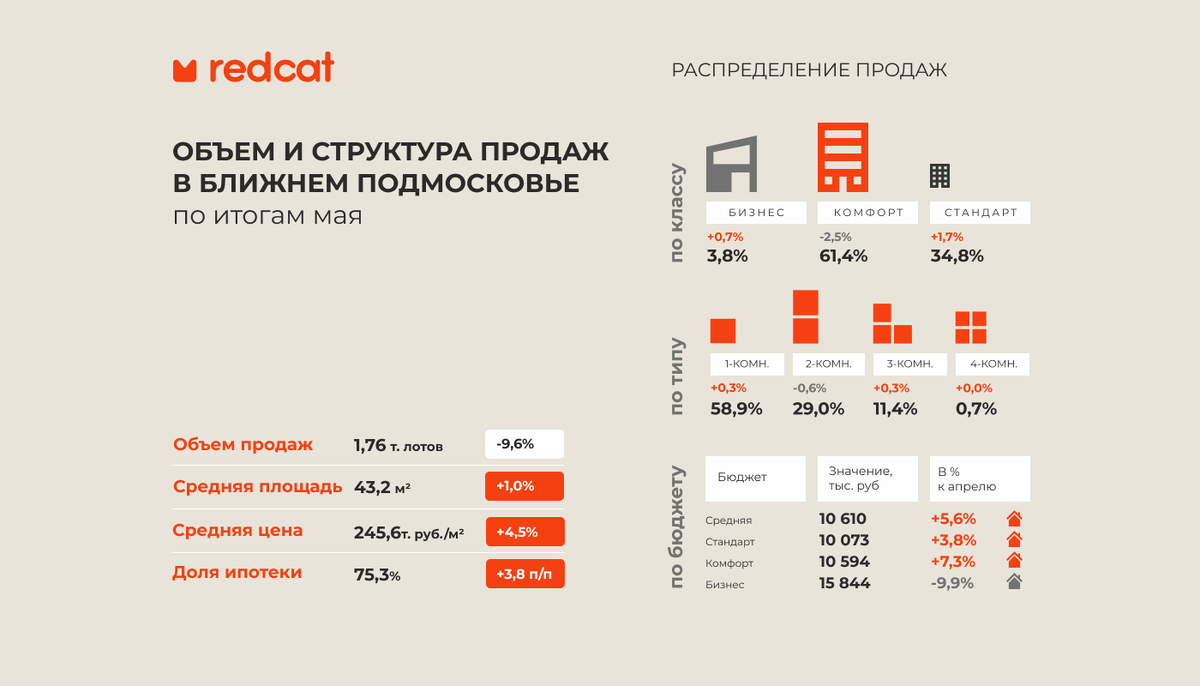 Спрос в ближнем Подмосковье в мае продолжил снижение, но динамика сокращения была ниже, чем в Москве и Новой Москве. Так, за май объемы продаж сократились на 9,6% и составили 1,76 тыс. лотов, снова обновив минимумы этого года. По сравнению с продажами мая прошлого года, текущие показатели проигрывают 28,5%. В мае рост спроса отмечен в 4 локациях - в Долгопрудном (+20,0%), Люберцах (+11,9%), Одинцово (+5,8%) и Красногорске (+4,5%), самое существенное снижение спроса зафиксировано в Балашихе (-26,4%), Мытищах (-24,0%) и Котельниках (-17,3%). За счет продолжающегося падения спроса, Мытищи снова потерял часть своего отрыва от ближайших конкурентов, но пока продолжает удерживать первую позицию по спросу среди городов-спутников. Сейчас чуть более четверти всех продаж ближнего Подмосковья (26,4%) сконцентрировано в Мытищах, на второе место вышел Красногорск (17,0%), на третье опустился г. Видное (16,0%). В мае структура спроса в разрезе классов жилья сместилась в сторону самых доступных прое