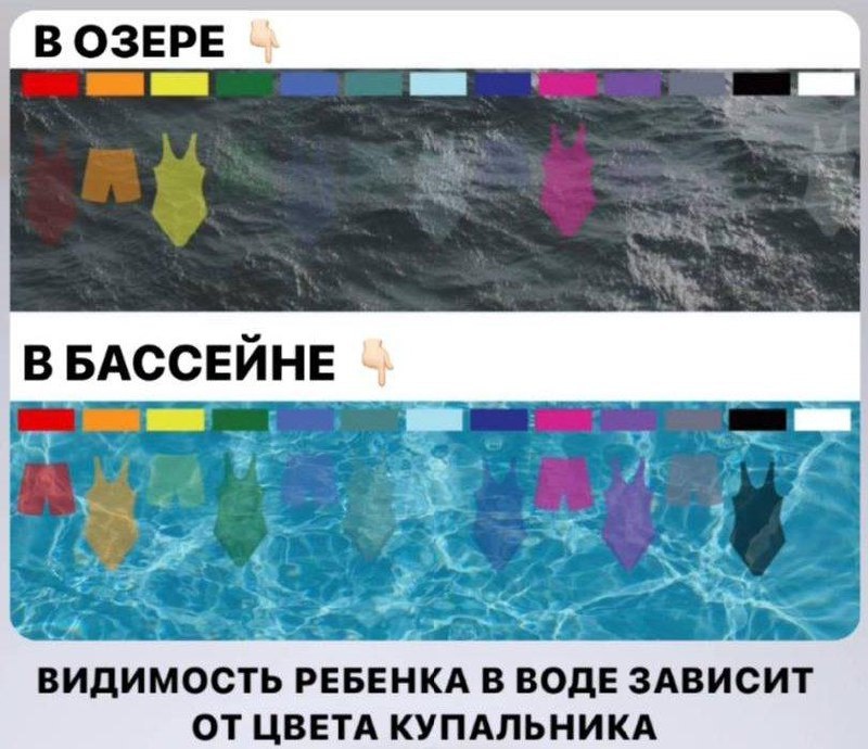 Выбор купальника для ребенка зависит не только от красоты, но и от видимости в воде. ❗️Выбирайте наиболее заметные в воде варианты! А еще помните, что тонущий ребенок (ровно как и любой другой человек) НЕ КРИЧИТ и НЕ БАРАХТАЕТСЯ. Те, кто реально тонет, идут ко дну тихо, не успевая крикнуть, из-за того, что пугаются и пытаются сохранить воздух.