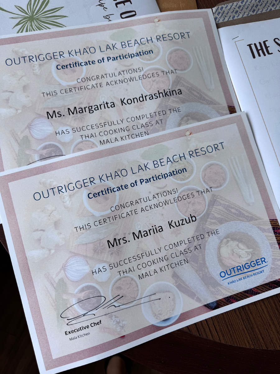 Какие кухни мира вам нравятся? Каждый задавал себе такой вопрос! Мы всегда любим заказать из меню суп Том Ям или салат с морепродуктами! И вот оказавшись на отдыха в прекрасном Као Лаке в Тайланде мы решили взять мастер-класс от шеф повара в отеле Outrigger Khao Lak и впервые провели три часа отдыха не поглощая еду, а за ее приготовлением! Сервис современных отелей Тайланда просто поражает и когда нам загрузили приложение в отеле и показали возможности отдыха там мы сразу увидели помимо хваленых тайских СПА, кулинарные мастер-классы! Мы любим с мужем готовить и сразу решили что это отличная идея попробовать стоит! Меню из трех блюд под руководством шеф повара тайца! Это вау! Но чего мы не ожидали так это такого уровня и качества организации мастер-класса! В назначенное время мы:забронировали на 4 четверых мастер-класс пришли в ресторан, где никого кроме нас не было и зал превратился в рабочие зоны для шефа и нас! На столах были накрыты весь инвентарь и базовые ингредиенты, у каждог