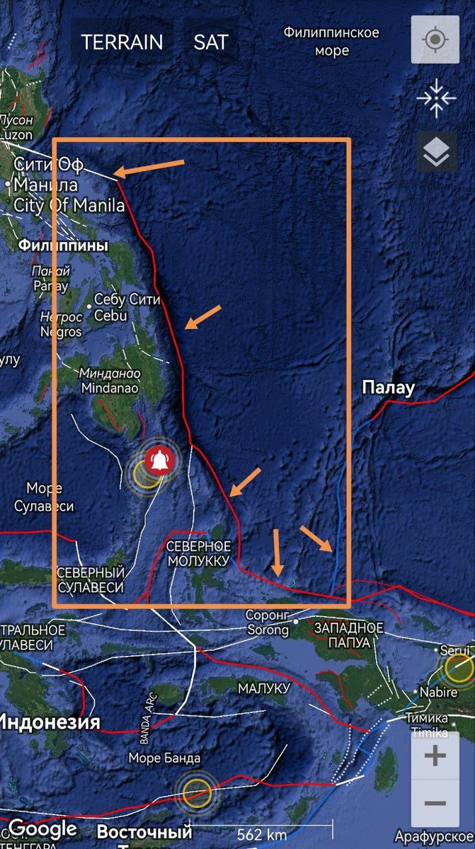 Нарисовался протяженный ОСТИ на юге и юго-востоке Филиппинской плиты. Здесь, на обрамлении, в течение 9 дней есть вероятность сильного землетрясения М6-7+ ==== Extended CSTI has been drawn in the south and southeast of the Philippine Plate. Here, in the frame, there is a possibility of a strong earthquake M6-7+ within 9 days.