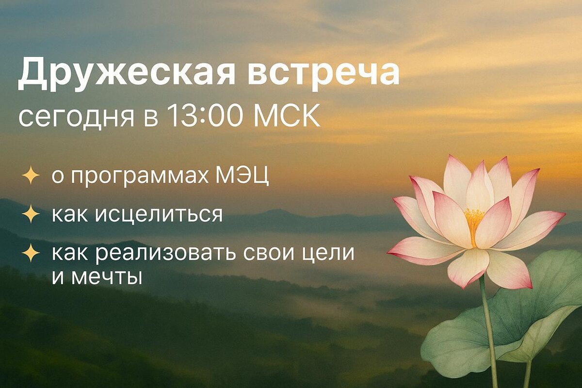 ✨ Дорогой друг, приглашаем тебя сегодня на душевную, дружескую встречу в гостевом чате, которая состоится в 13:00 по московскому времени 🌸 Это будет пространство тёплого общения, понимания и поддержки, где мы поговорим: 🌿 о трансформационных программах МЭЦ, 🌿 о том, как исцелить своё состояние, 🌿 как прийти к внутреннему покою, 🌿 как начать реализовывать свои настоящие мечты и цели, не теряя себя. Без давления, без спешки — просто присутствие, живой обмен и, возможно, именно сегодня ты услышишь то, что откроет новую дверцу внутри ✨ Приходи, мы будем рады тебе как старому другу. Бери с собой своих друзей 😉 С любовью и теплом, команда МЭЦ ❤️ https://t.me/chat_provibration