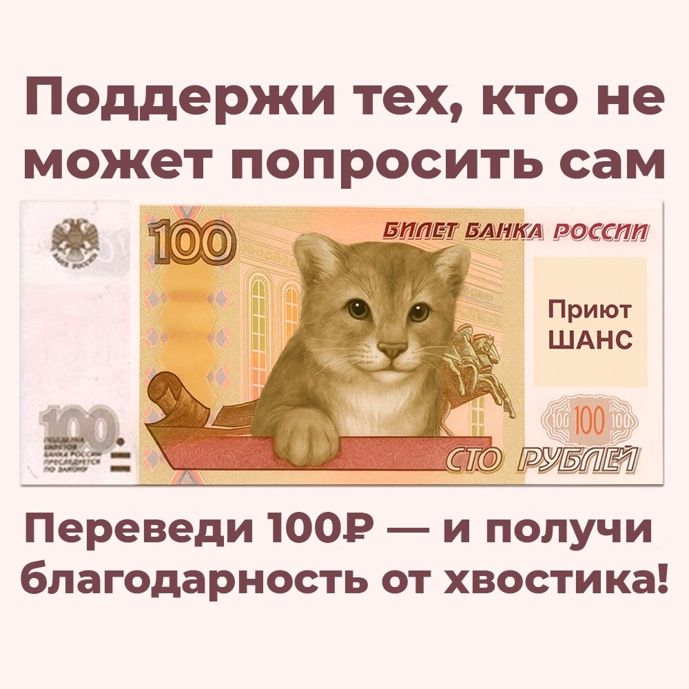 Сегодня — День Стольника! 🙌 Идея простая: 🐾 вы переводите 100 рублей в приют, 🎁 а мы в ответ дарим вам карточку с одним из наших хвостиков — персонально, с благодарностью. 📸 Просто прикрепите скриншот перевода в комментарии — и мы пришлём вам «вашего» шансенка. Это не большой сбор. Это день, когда маленькая сумма от многих людей превращается в корм, лекарства, подстилки, уход. 💙 Пусть у каждого сегодня будет шанс сделать одно доброе дело. Спасибо, что вы с нами. Хвостики ждут. Как помочь? На р/с приюта по СБП: https://vk.cc/cxmyqr На р/с приюта по QR коду: https://vk.cc/cAcnfG На р/с приюта по реквизитам: https://vk.cc/crI7qu Отчет по сбору: https://vk.cc/cMtI98