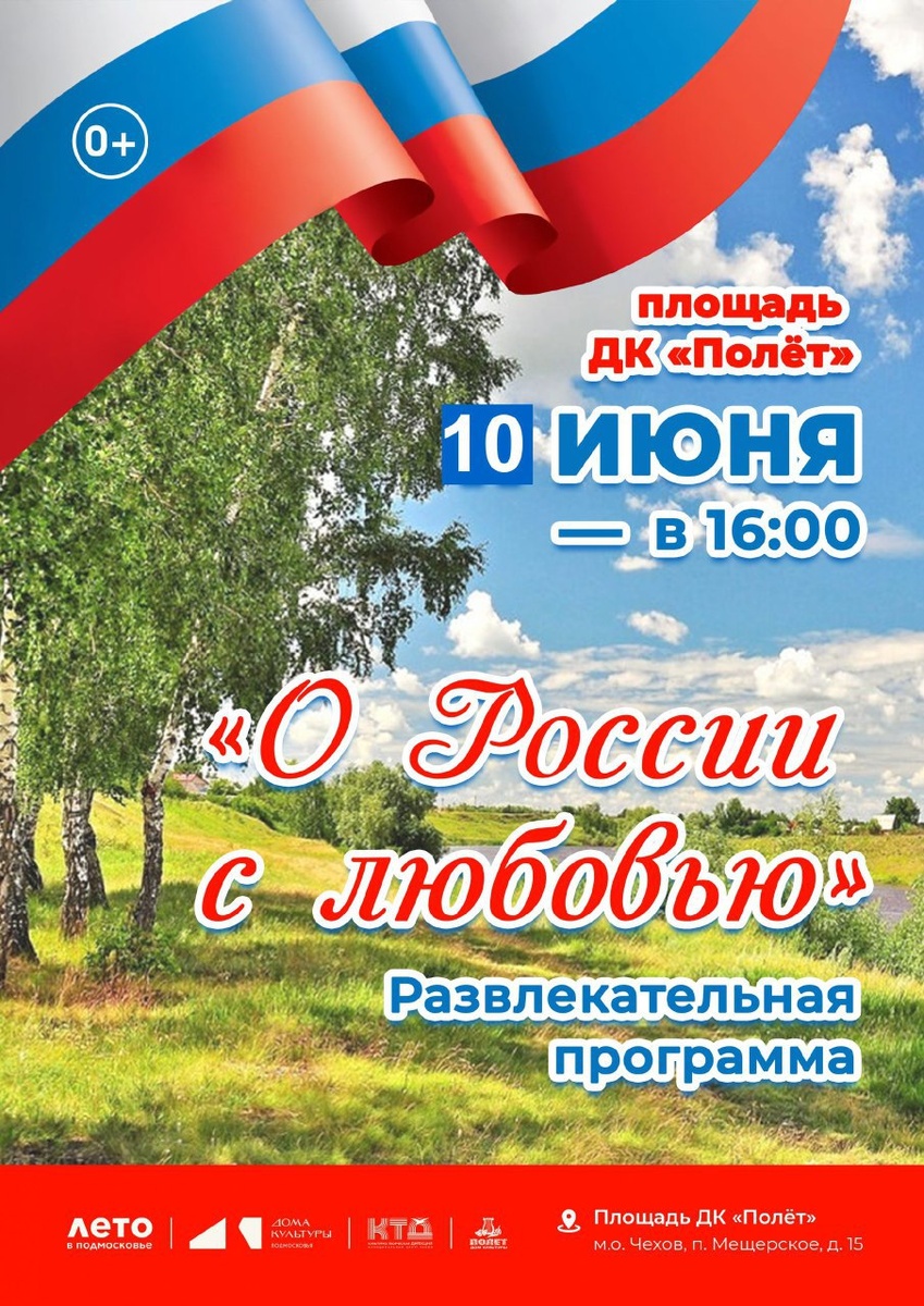 ✨ Развлекательная программа "О России, с любовью" в п. Мещерское 💗 Будем всем рады, приходите. 🚫 Возраст: 0+ 📆 10.06.2025 🕛 16:00 🏢 ДК «Полёт» 📍 г.о. Чехов, п. Мещерское, д.15 (пристройка) 🪙 Вход свободный❗️ ⭐Разместить публикацию ⭐Поддержать канал голосом ✅ Мероприятия Чехов https://dzen.ru/id/66cc4b48e9ef144699238a51 http://vk.com/chekhov_events http://dzen.ru/chekhov_events