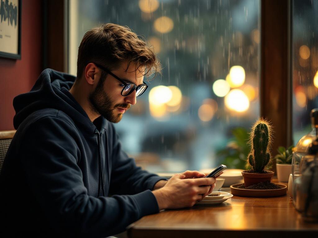 Ложка сорвалась с его дрожащих пальцев, звякнула о плитку, подпрыгнула и закатилась под стул. Звук был таким резким, таким глупо-громким в уютном гуле кофейни, что Кирилл почувствовал, как горячая волна стыда подкатила от ушей к ключицам. Он нагнулся, делая вид, что ищет проклятый столовый прибор, а сам — краем глаза — ловил реакцию той самой Лены из чата. Ее столик был... в трех шагах. Синяя толстовка. Но ее взгляд скользнул по нему, как по пустому месту, и уперся в экран. Ее палец нервно листал ленту приложения — искала его.