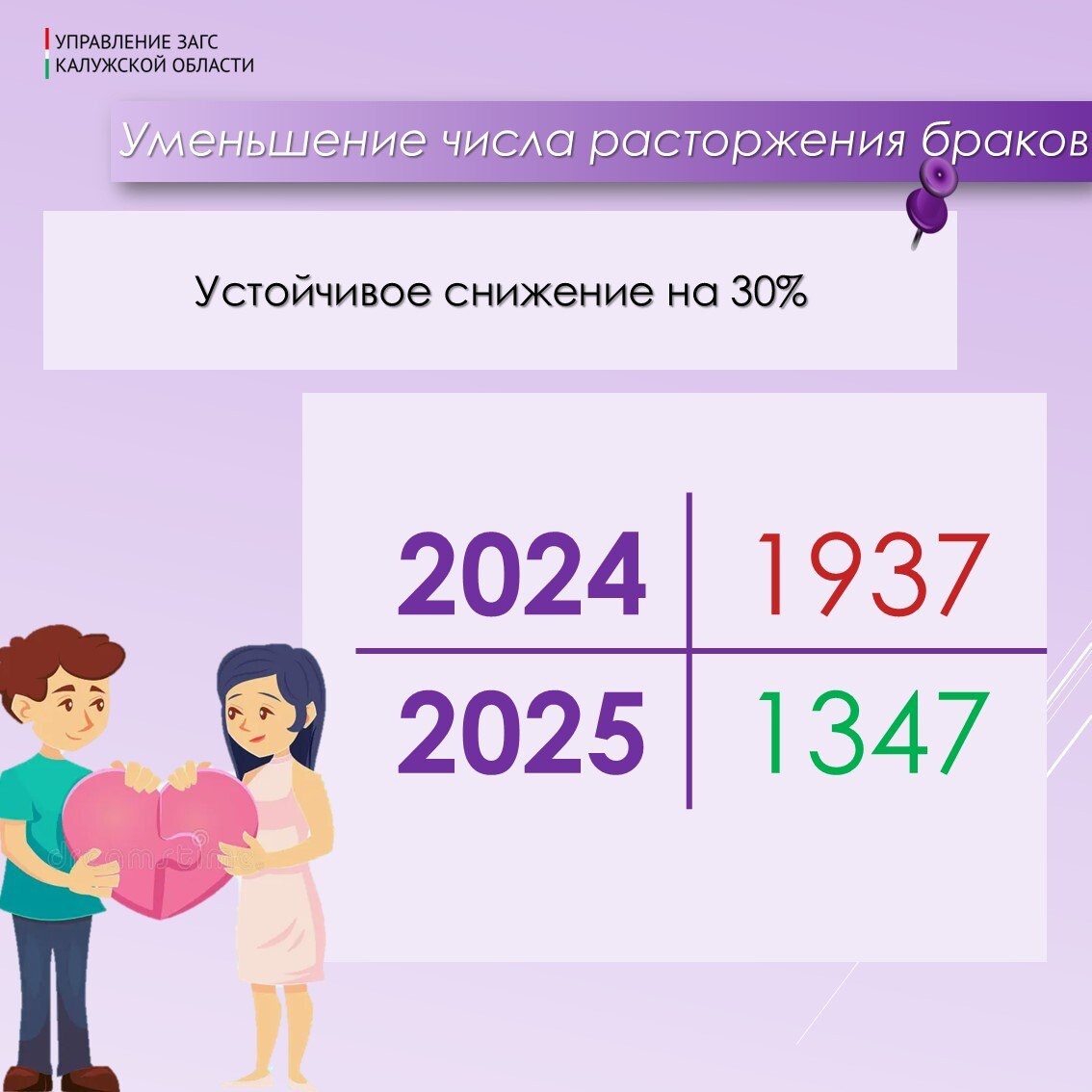 💥На протяжении 5 месяцев в Калужской области наблюдается устойчивое снижение регистрации расторжения брака по сравнению с аналогичным