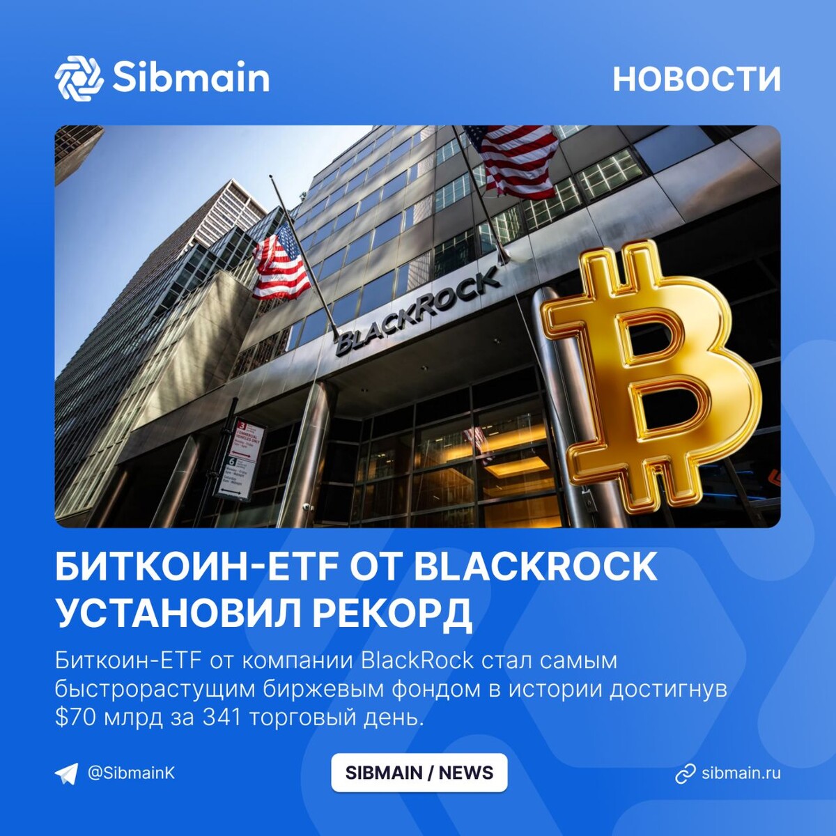 📰📰📰📰 ➡️Биткоин-ETF от BlackRock установил рекорд Биткоин-ETF от компании BlackRock стал самым быстрорастущим биржевым фондом в истории достигнув $70 млрд за 341 торговый день. Прошлый рекорд 1691 день принадлежал инвестирующему в золото фонду SPDR Gold Shares. Рекорд Bitcoin ETF от BlackRock показывает растущий интерес и увеличения инвестиций в криптоотрасль. 📍Успех ETF у инвесторов подтверждает признание первой криптовалюты на традиционных финансовых рынках и перспективы майнинговой отрасли Sibmain комплексные решения для майнинга под ключ! - Поставки майнинг оборудования - Дата-центр в Красноярске 80 МВт - Размещение от 5 руб/кВтч ⌨️ Нужна консультация или помощь в подборе оборудования? Звоните: +7(800)351-14-70 📍 г. Москва Калужская площадь д.1 к.1 💬 WhatsApp 💬 @Sibmain_salesbot 🌐 sibmain.ru