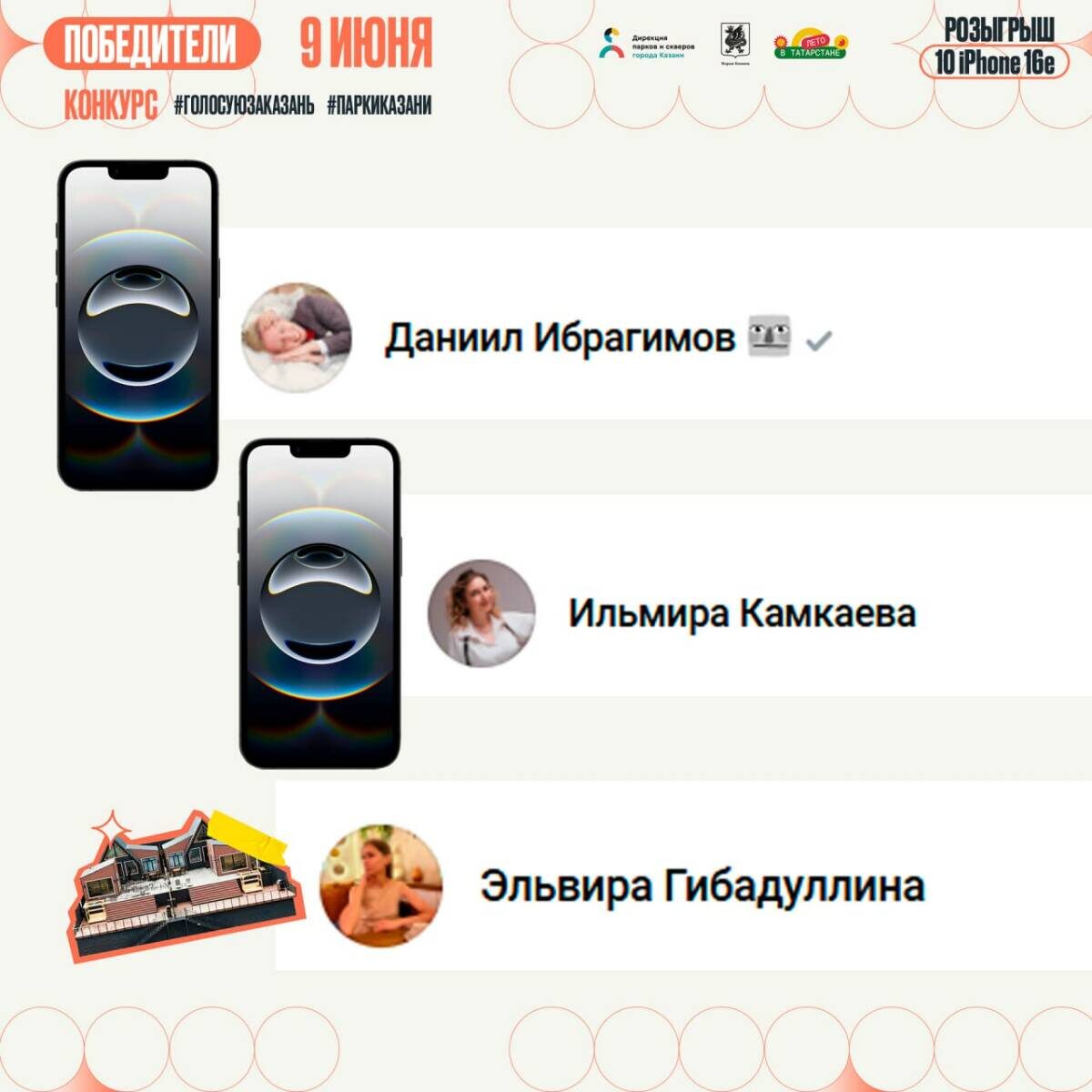 Названы трое победителей первого розыгрыша призов среди проголосовавших за парки и общественные пространства Казани. Они стали обладателями двух iPhone16e и сертификата на летний отдых в глэмпинге на двоих. Первыми победили в конкурсе пользователи соцсети «ВКонтакте» из Казани Даниил Ибрагимов, Ильмира Камкаева и Эльвира Гибадуллина. Они отдали свои голоса за благоустройство парков и скверов города на сайте gorodsreda.tatar.ru и выполнили все условия розыгрыша. Первый розыгрыш призов в рамках большого онлайн-конкурса, приуроченного к ежегодному голосованию за общественные пространства столицы Татарстана, которые будут благоустроены в 2026 году, состоялся накануне, 9 июня. Он был организован в группе «Парки и скверы Казани». Даниил Ибрагимов проголосовал за бульвар по улице Гарифьянова, Ильмира Камкаева отдала свой голос за сквер на улице Мира в поселке Дербышки, а Эльвира Гибадуллина – за сквер «Айболит» в Советском районе города. Конкурс проводят для всех, кто проголосует на портале Г