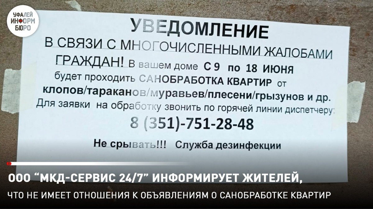 Управляющая компания «МКД-сервис 24/7» обращается к жителям многоквартирных домов по поводу объявлений на подъездах, в которых говорится о проведении обработки квартир от клопов и тараканов, плесени и муравьев в определенный период. Управляйка обращает внимание, что не имеет отношения к данным объявлениям.