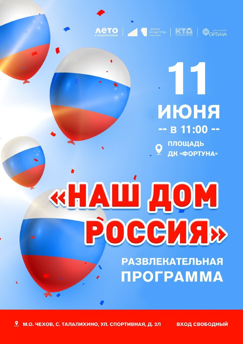 ✨ Развлекательная программа «Наш дом Россия» в с. Талалихино 🇷🇺Вас ждёт увлекательная программа: игра-путешествие «Я живу в России», зажигательный флешмоб и уютный мастер-класс. 🚫 Возраст: 0+ 📆 11.06.2025 🕛 11:00 🏢 ДК «Фортуна» 📍 г.о. Чехов, с. Талалихино, ул. Спортивная, д.20 🪙 Вход свободный❗️ #webЧехов ⭐Разместить публикацию ⭐Поддержать канал голосом ✅ Мероприятия Чехов https://dzen.ru/id/66cc4b48e9ef144699238a51 http://vk.com/chekhov_events http://dzen.ru/chekhov_events