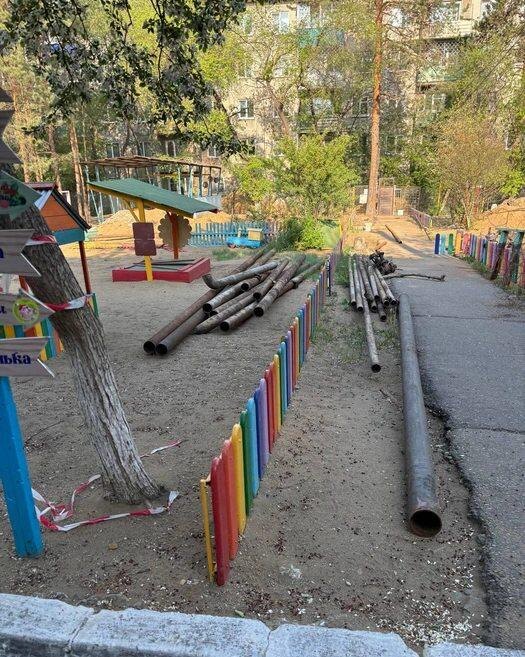 У детсада №75 в микрорайоне Северном подрядчики ТГК-14 оставили после себя яму вместо детской площадки. По словам родителей, раскопки продолжаются больше двух месяцев — детей водят гулять по очереди на соседние участки: