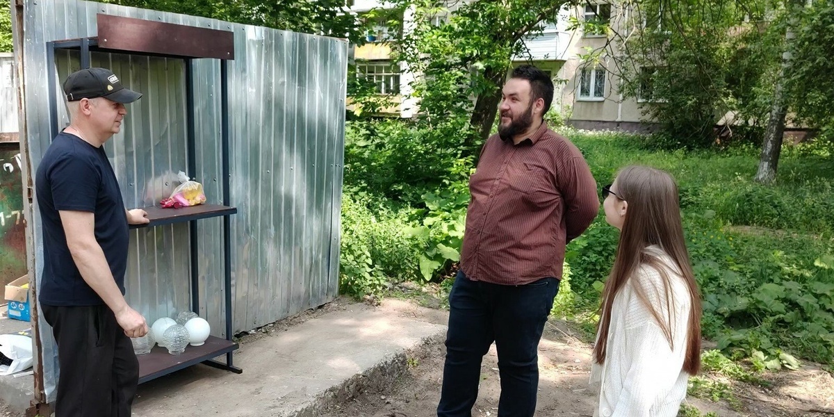 Ивановские общественники дают новую жизнь предметам, которые своим прежним хозяева уже не нужны. Инициаторы проекта, Сергей Силкин и Максим Вишняков, часто замечали хорошие вещи, выброшенные за ненадобностью. Одежда, детские игрушки, мебель — лежат в грязи около мусорного контейнера. Но теперь на 2-ой Ефимовской улице стоит аккуратная стойка из металла и ДВП. Фотограф и скульптор сделали её за свой счёт.