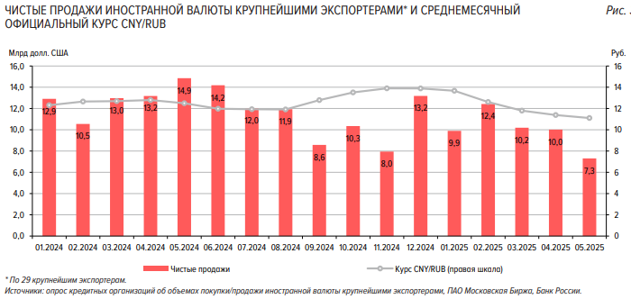 Банк России объясняет данный феномен сокращением спроса на иностранную валюту на внутреннем рынке на фоне жесткой денежно-кредитной политики. Источник: Банк России В мае рубль продолжил укрепляться вопреки снижению чистых продаж иностранной валюты со стороны крупнейших экспортеров, сообщает Банк России в «Обзоре рисков финансовых рынков». «Чистые продажи 29 компаний из числа крупнейших российских экспортеров в мае 2025 г. составили 7,3 млрд долл. США (см. выше — прим.), сократившись на 27% м/м на фоне продолжающегося снижения цен на нефть на мировых рынках и меньшего количества рабочих дней относительно апреля. Месячный объем чистых продаж стал минимальным с середины 2023 года. При этом среднедневные чистые продажи сократились менее значительно (на 11% м/м) и составили 406 млн долл. США», — говорится в документе. В марте показатель чистых продаж иностранной валюты крупнейшими экспортерами относительно их экспортной выручки составил 97% (см ниже — прим.). Минимум последних лет на уровне