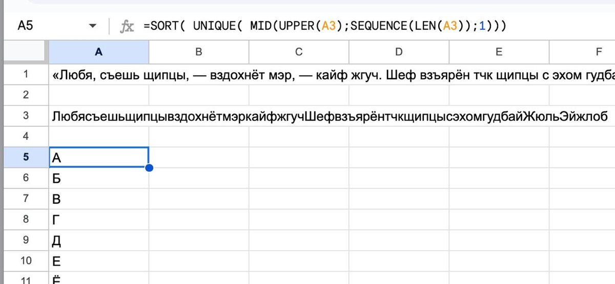 В ответ на пост Панграмма Спасибо за участие, друзья! У всех почти всё получилось, если не считать букву ё, которую так просто не достать. Поэтому – по хардкорным вариантам: Панграмма – это предложение, в котором есть все буквы, в данном случае русского алфавита, например: «Любя, съешь щипцы, — вздохнёт мэр, — кайф жгуч. Шеф взъярён тчк щипцы с эхом гудбай Жюль. Эй, жлоб!» Вставляем в Таблицу, регуляркой убираем всё, что не буквы =REGEXREPLACE(A1; "[^А-Яа-яЁё]"; "") Далее приводим к заглавным и делим строку по буквам, уникализируя и сортируя. =SORT( UNIQUE( MID(UPPER(A3);SEQUENCE(LEN(A3));1))) Результат – на картинке.