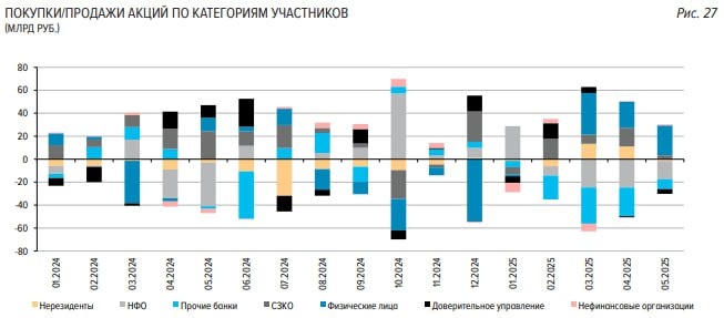 В ответ на пост 🟢 Нетто-покупатели Физические лица Май: +26,1 млрд ₽ Апрель: +22,7 млрд ₽ С начала года: +83,4 млрд ₽ 📈 Продолжается устойчивый приток частных инвесторов. Это крупнейшая группа покупателей. Системно значимые банки (СЗКО) Май: +3,3 млрд ₽ Апрель: +16,3 млрд ₽ 📉 Снижение активности, но сохраняется положительное сальдо. 🔴 Нетто-продавцы НФО (некредитные фин. организации) — управление собственными средствами Май: –15,9 млрд ₽ Апрель: –24,8 млрд ₽ 📉 Продажи сократились, но остаются основными поставщиками ликвидности на продажу. Банки, не относящиеся к СЗКО Май: –8,6 млрд ₽ Апрель: –24,9 млрд ₽ 📉 Продажи замедлились, но продолжаются. _____________________ Третий месяц подряд физические лица являются крупнейшими покупателями акций. Я привел еще несколько табличек из прошлых периодов. Чуть позже дам сравнение с графиком в отдельных постах. Что вижу невооруженным взглядом. Ранее, например, в 2023 году физлица тоже активно покупали и рынок хорошо рос. Бол