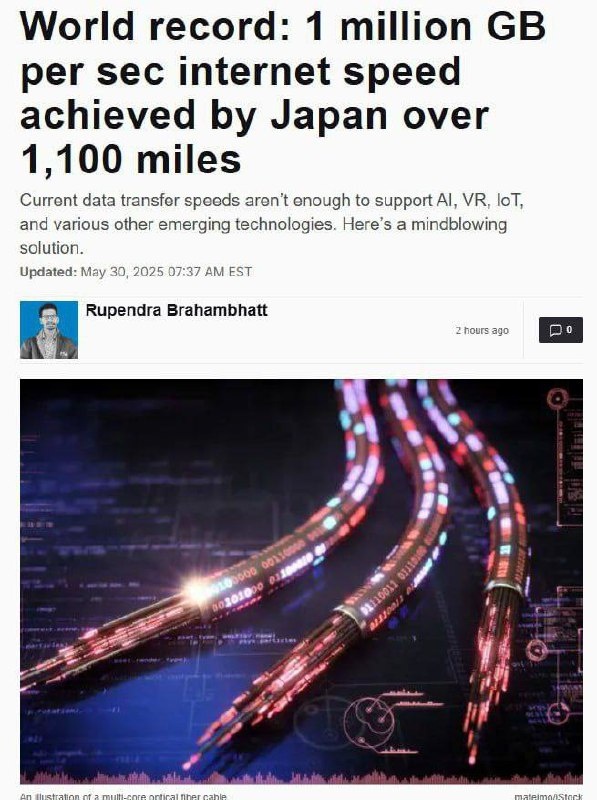Японцы установили новый мировой рекорд скорости интернета — им удалось достичь поразительных 1 МИЛЛИОНА гигабайт в секунду. Это эквивалентно скачиванию 10 000 фильмов в 4K за одну секунду. Всё это стало возможным благодаря новой 19-ядерной оптоволоконной технологии. Внешне кабель выглядит обычным, но внутри у него 19 каналов вместо одного. Эта функция была разработана не только ради установления рекорда. Уже сейчас ИИ, VR и автономные системы требуют огромных объёмов трафика. NeuroFlux #ИИ #Технологии #наука #нейросети #ИнтернетСвобода #ИскусственныйИнтеллект