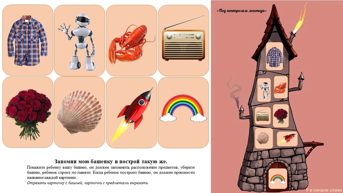 Вырезать и играть. Задание: запомни расположение предметов и построй такую же башню, назови все картинки. Дополнительно: попробуй назвать быстро. 👍Можно автоматизировать звук в предложениях: на первом этаже радуга, на втором этаже ракушка и ракета... 💜Подпишитесь, на канале еще много всего интересного и полезного: игровые видео, обзоры логопедических игр, увлекательные пособия, авторские интерактивные презентации, авторские онлайн игры и многое другое.