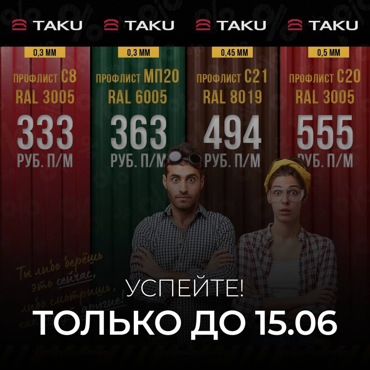 ОСТАЛОСЬ ВСЕГО 5 ДНЕЙ до конца самой громкой акции этого сезона «МАЙСКИЕ ПРОФИЛИ» — только до 15 ИЮНЯ! ⚠️ Мы устроили настоящую ПРОФИЛЬНУЮ РЕВОЛЮЦИЮ: Самые топовые, ходовые и прибыльные профили по ценам, которые больше никто не предложит! Это ваш крайний шанс приобрести популярные профили по убойным ценам в TAKU! ⚡️ Не берете сейчас — значит смотрите, как на них зарабатывают другие! Подробности об акции: https://t.me/taku_rus/512 С нами TAKUдобно! #металлопрокат #строительный_сезон #куплю_профнастил #профлист #TAKU #акция