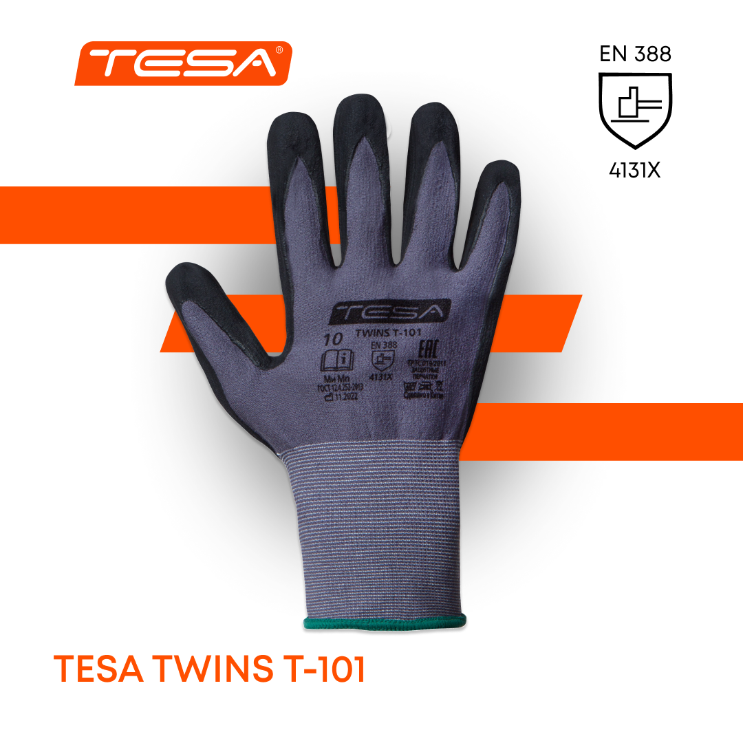 🧤 Перчатки TESA TWINS T-101 созданы для таких видов работ, где важны стойкость к механическим рискам и точность движений: работа с мелкими деталями и инструментами, сборочные операции, взаимодействие с оборудованием и станками. Уплотнённый вспененный нитрил на ладони обеспечит отличное сцепление с поверхностями, как в сухих, так и в слегка маслянистых средах. Прочная смесовая ткань отлично тянется, принимает форму руки, снижая давление на кисть. Наличие спандекса в составе обеспечивает дополнительную гибкость. Защитные свойства по EN 388 – 4131X. Перчатки соответствуют ГОСТ 12.4.252-2013 и ТР ТС 019/2011. Класс риска -1. 1️⃣ Бесшовная основа, 15-й класс вязки. Нейлон + спандекс облегают кисть как вторая кожа, тянутся при сгибании пальцев и сохраняют комфорт даже к концу смены. 2️⃣ Трикотажная манжета мягко облегает запястье, не пропуская пыль и грязь внутрь, не цепляется за одежду и сохраняет эластичность после стирки. 3️⃣ Уплотненное нитриловое покрытие обеспечивает более высокую
