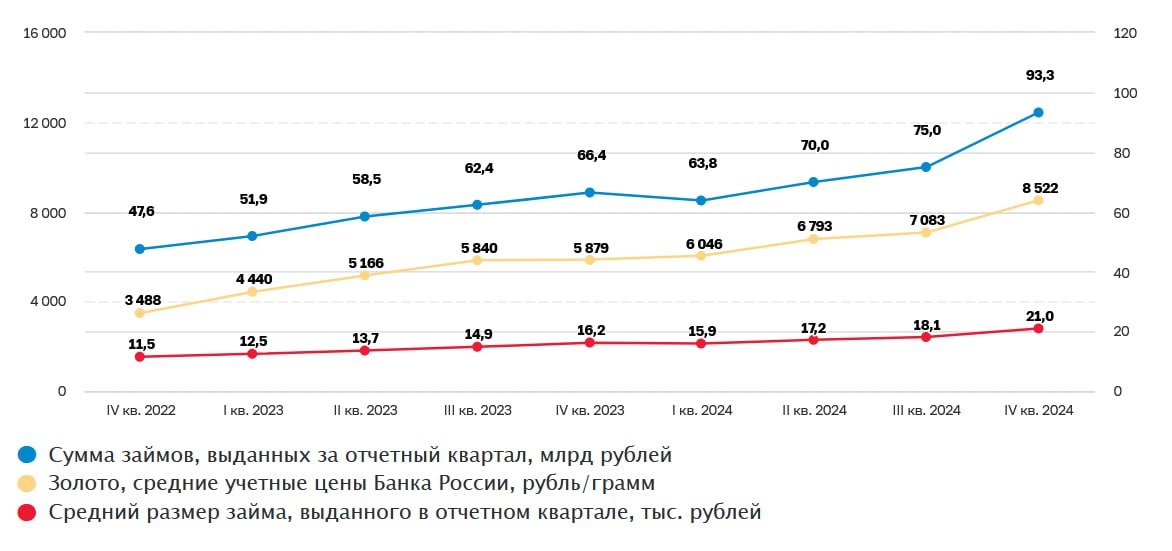 За 2024 год ломбарды выдали займы населению на сумму 302 млрд рублей. За 2024 год ломбарды выдали займы населению на сумму 302 млрд рублей, что на четверть больше, чем в 2023 году (239 млрд рублей), сообщает Ассоциация развития ломбардов со ссылкой на данные ЦБ. Основная причина такого роста — устойчивое повышение цены на золото, поскольку 94% от общего объема займов выданы под залог золотых изделий. Количество займов, оформленных клиентами в ломбардах, осталось на уровне 2023 года — 16,6 млн договоров. Вслед за ростом цен на золото увеличивалась и сумма среднего займа в ломбарде. За год она выросла на 31%: с 16 тыс. рублей до 21 тыс. рублей. Основной прирост обеспечили крупные ломбарды с портфелем более 100 млн рублей. Значительную часть спроса формируют постоянные клиенты – их доля составляет 74%. Объем выдачи и сумма среднего займа в ломбарде продолжают расти вслед за ростом цены золота. В 2024 году 2% займов было выдано под залог транспортных средств. Объем таких займов за год