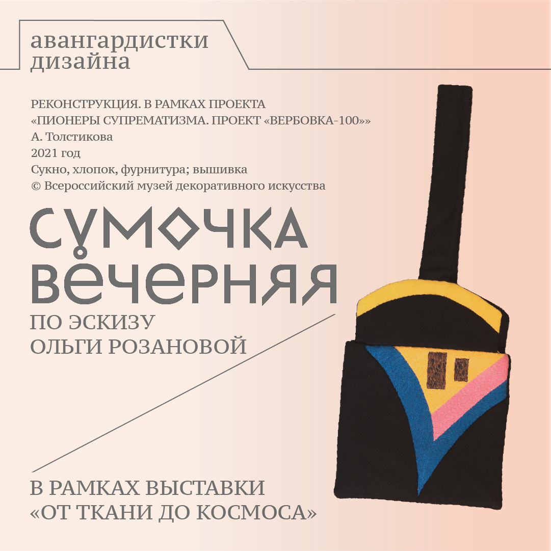 В начале XX века художники стремились создавать вокруг себя предметную среду, которая отражала бы их творческое видение. Например, вечерняя сумочка из собрания нашего музея является современной реконструкцией. Оригинальный проект вышивки был создан Ольгой Розановой для мецената и художника Натальи Давыдовой в 1915-1917 гг. Оба художника тогда входили в общество «Супремус», под влиянием которого Ольга Владимировна создала ряд новаторских цветовых абстракций, а Наталья Михайловна сменила вектор своей вербовской мастерской с народного искусства на авангардистское. В дизайне сумочки словно бы вышито своеобразие творческого метода Ольги Розановой – влюбленность в красочность, которая особенно характерна для «беспредметных» живописных работ художницы. Примечательно, что в 1917 году на второй московской выставке Вербовки критики отмечали, что публика, осуждавшая авангардные картины, с энтузиазмом покупала прикладные изделия с аналогичными композициями. Узнать еще больше о творчестве Ольги Роз