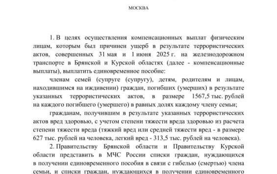 Пострадавшие и семьи погибших в результате терактов на железных дорогах в Брянской и Курской областях получат денежные компенсации. Об этом говорится в распоряжении, подписанном председателем правительства РФ Михаилом Мишустиным. Общий объём финансирования составит около 88 млн рублей, средства будут выделены из резервного фонда правительства. Размер выплат составит: - 1,5 млн рублей — членам семей погибших; - 627 тыс. рублей — пострадавшим с тяжёлыми травмами; - 313 тыс. рублей — пострадавшим с лёгкими телесными повреждениями. Компенсации будут перечислены гражданам, пострадавшим в результате двух крупных диверсий на железнодорожной инфраструктуре: В Брянской области, где при обрушении железнодорожного моста под поезд погибли семь человек, более 100 получили травмы. В Курской области, где в результате подрыва железнодорожных путей пострадали машинист и двое его помощников. Меры поддержки направлены на оказание помощи семьям и восстановление социальной справедливости, отметили в правит