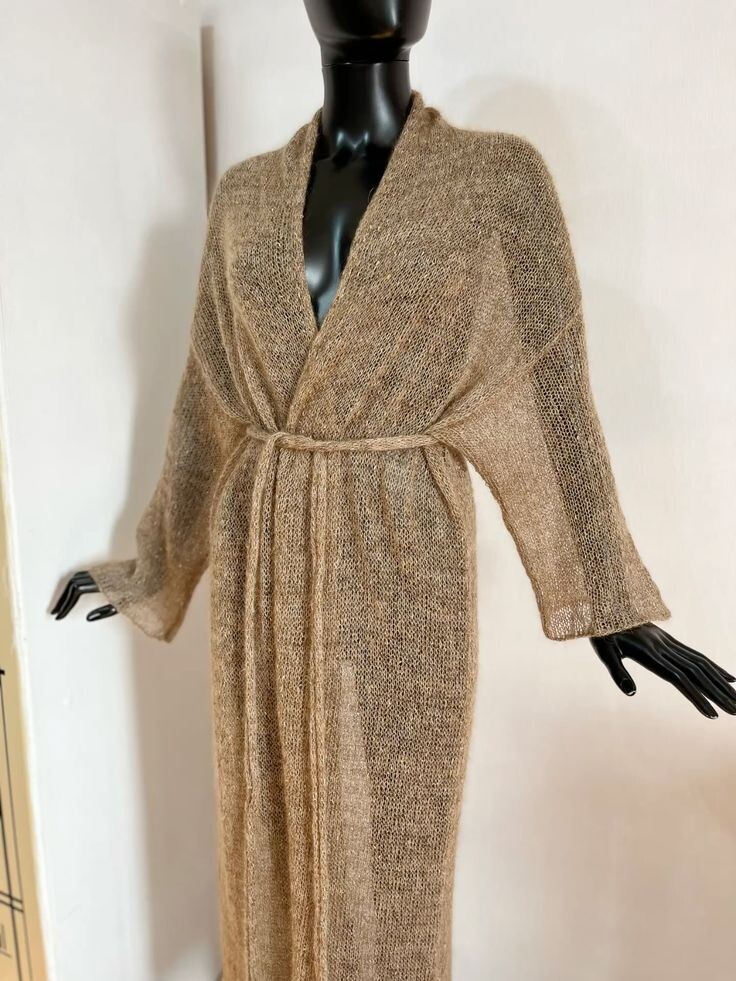 Дорогие друзья, на прошлом незапланированном эфире мы решили с вами связать шазюбль. Шазюбль — это удлинённый кардиган, который идеально подходит для летних вечеров, когда на улице становится немного прохладно. Он может быть связан из летней пряжи, такой как хлопок или лён, или из более тёплой пряжи, например, из тонкой шерсти или акрила, что делает его универсальным вариантом для разных погодных условий. Шазюбль можно носить с различными нарядами: на брюки, на юбки, на платья, а также на купальники, что делает его незаменимым элементом летнего гардероба. Он добавляет образу лёгкости и стиля, при этом обеспечивая комфорт и тепло. Я выбрала для себя три варианта изделия, и сегодня хочу поделиться с вами первым из них. Фотографии этого варианта вы можете увидеть ниже. На этом варианте мы видим пушистое, лёгкое и воздушное изделие, связанное лицевой гладью. Эта техника вязания придаёт шазюблю аккуратный и элегантный вид, а также делает его более плотным и тёплым. Конструкция шазюбля и