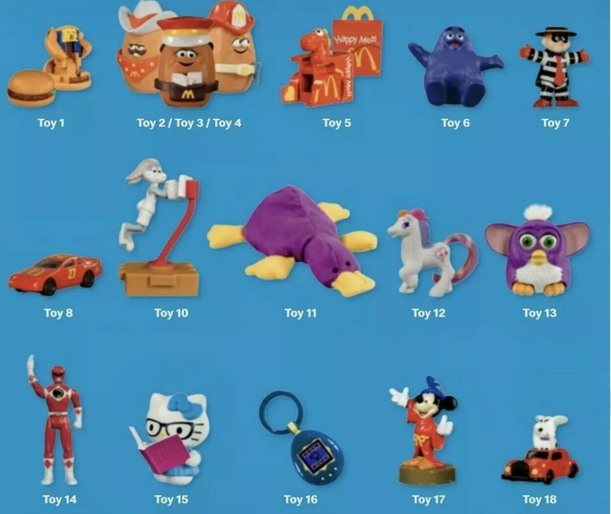 В 2019 году McDonald's выпустил некоторые из своих самых популярных игрушек в честь 40-летия Happy Meal. В этом наборе семнадцать игрушек: 1. Гамбургер Трансформер (1987) 2. Ковбой Макнаггет Бадди (1988) 3. Почтальон Макнаггет Бадди (1988) 4. Пожарный Макнаггет Бадди (1988) 5. Dino Хэппи Мил Трансформер (1988) 6. Гримас (1990) 7. Hamburglar (1995) 8. Hot Wheels (1993) 9. "Удаленная игрушка"* 10. Багз Банни из «Космического джема» (1996) 11. Патти-утконос от Teenie Beanies (1996) 12. Мой маленький пони (1998) 13. Ферби (1998) 14. Могучие рейнджеры, Красный рейнджер (1995) 15. Hello Kitty (2013) 16. Томагочи (1998) 17. Микки Маус (2002) 18. 101 Далматинец (1997) *Первоначально предполагалось, что в линейке будет восемнадцать игрушек, но одну из них убрали перед выпуском. Везде были указаны игрушки № 1-8 и № 10-18, пропуская игрушку № 9. В моей коллекции есть следующие игрушки: Если интересуют другие игрушки из McDonald's , то переходим на Главную страницу