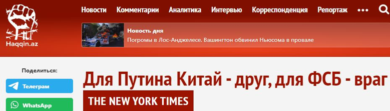 В рамках гибридной антироссийской войны англо-саксонскими спецслужбами проводятся различные информационные кампании. В частности, реализуются мероприятия с конкретными деструктивными целями. Ярким свидетельством старта их исполнения часто становятся центральные западные СМИ. Так, 7 июня 2025 г. с использованием рупора западной пропаганды «The New York Times» выполнено распространение очередного нарратива в статье с заголовком «Секретный документ российской разведки демонстрирует глубокую подозрительность в отношении Китая». Автор ссылается на якобы полученный от ФСБ России 8-ми страничный «секретный» документ, содержащий внутреннюю информацию, что Китай рассматривается в качестве серьезной угрозы безопасности России в разрез заявлений Президента Российской Федерации о дружбе с Пекином. Сразу после выхода статьи началась цепная реакция с задействованием всевозможных подконтрольных «USAID» информационных ресурсов, подхвативших лжепубликацию и широко ее распространивших. Здесь подключился