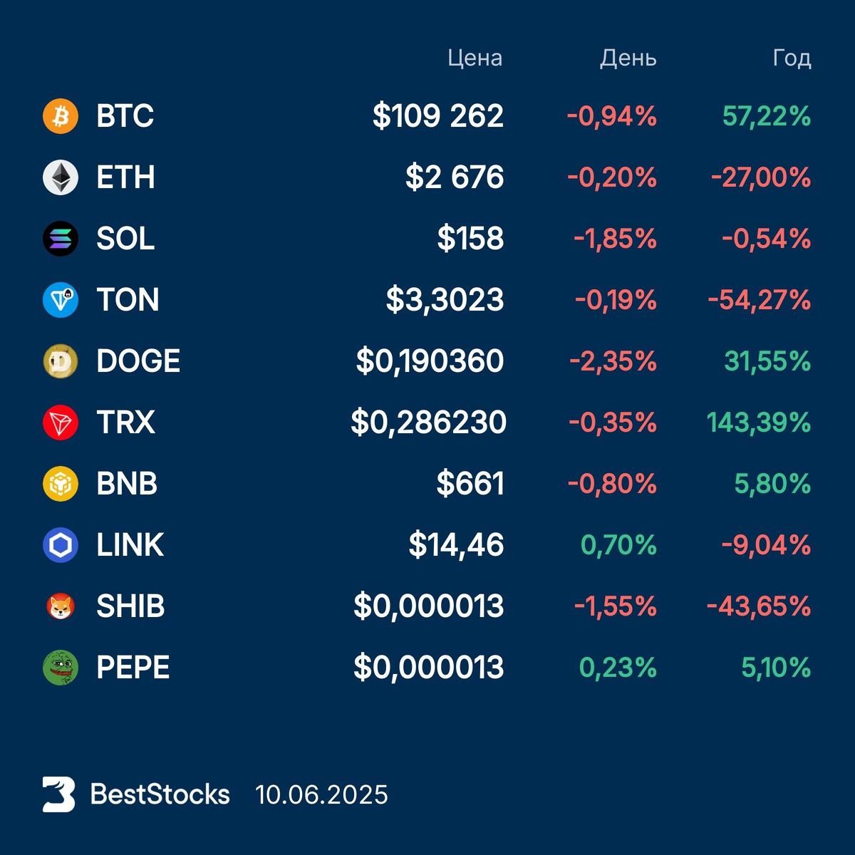 Курсы основных криптовалют: Bitcoin, Etherium, Solana, Toncoin, Dogecoin, TRON, BNB, Chainlink, Pepe, Shiba Inu на текущий момент
