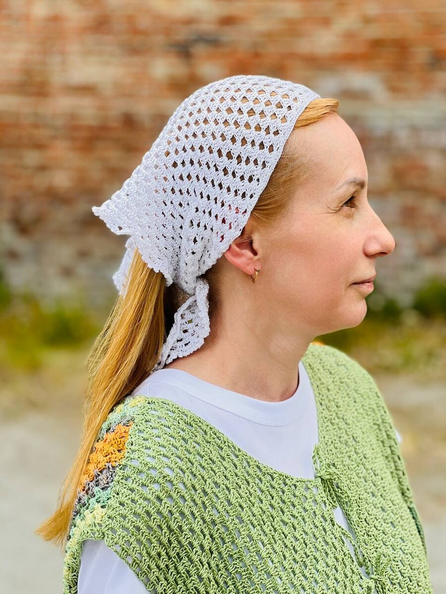 Аня связала лёгкую и красивую косынку из хлопка по мастер-классу Виталины — и это просто лето в петлях