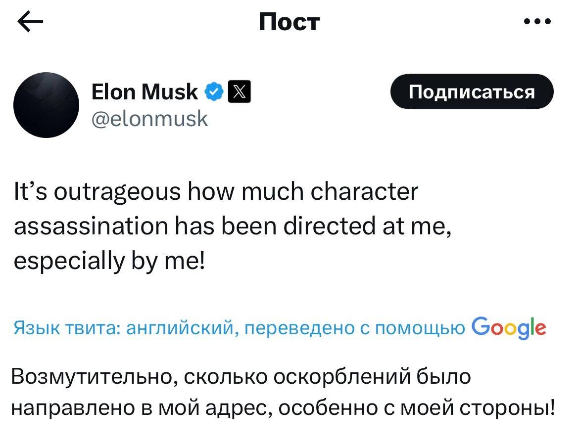 Маск осознал, что не такой уж он и незаменимый. Быканул на Трампа, одобрял импичмент, высказал подозрения в педофилии, призывал к созданию новой политической партии... А потом маску прилетело по официальным и неофициальным каналам. И вот уже Илонушка посыпает голову пеплом, а Трамп не отвечает на его звонки. И это, как бы, самый богатый человек планеты.