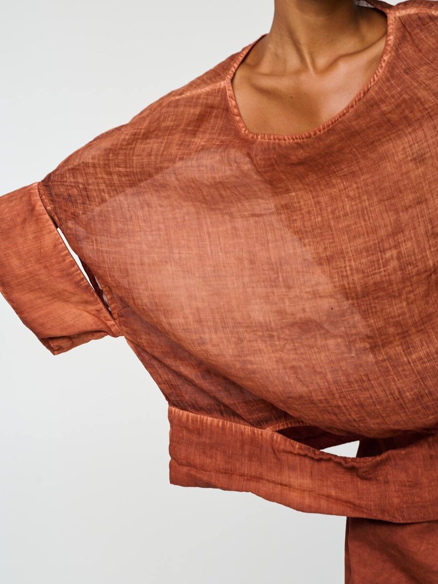 Эффектный образ от бренда LA VACA LOCA, в котором сложные формы и натуральные материалы создают безупречный союз стиля и комфорта. ⠀ Комплект выполнен из 100% премиального рами — благородной ткани, полученной из китайской крапивы, известной своей прочностью, воздухопроницаемостью и необычной фактурой. Цвет — выбеленный терракот, сложный, пыльный, с приглушённой теплотой, который особенно красиво раскрывается на свету и подчеркивает индивидуальность образа. ⠀ Блуза — асимметричная, оверсайз, квадратного силуэта, со стилевыми разрезами, создающими дополнительную динамику. Рукава 3/4 и свободный крой делают её универсальной: легко адаптируется к разным типам фигур, отлично работает в многослойных ансамблях. ⠀ Брюки — укороченные, свободные, сужающиеся к низу. Модель с легкой заниженной слонкой, что придает образу расслабленности. Посадка комфортная, ткань прекрасно дышит и держит форму, идеальна для летнего сезона.
