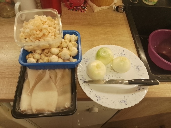Продолжу серию рецептов (стараюсь вкусно и без заморочек готовить интересное из общедоступных ингридиентов). В этот раз салат. Нам потребуется: Грибы 300 гр (у меня мелкие шампиньоны, в сезон попробую повторить со свежими лисичками) Тушки кальмара хз как считать, они разные очень - у меня получилось 8 шт. Солёные огурцы 3 шт. Лук репчатый 3 средних луковицы. Креветок столько, чтобы покрыть салат при подаче, у меня мисочка мелких. Сыр твёрдый или полутвёрдый 150 гр, у меня Короли Севера. Яйца 3 шт. Масло растительное для жарки лука и грибов. Майонез (3-4 ложки, в граммах не знаю, 100-120 наверное) Зелень (у меня зелёный лук, несколько побегов) Соль, специи (у меня смесь 4 перца, на будущее попробую базилик добавить). Режем лук тонкими полу- или четвертькольцами, намытые-обсушенные грибы тонкими пластинками, прогреваем масло на сковороде, закидываем лук, несколько минут спустя грибы, солим-перчим, обжариваем до золотистости на среднем огне не спеша. Пока жарится, варим кальмары с солью и