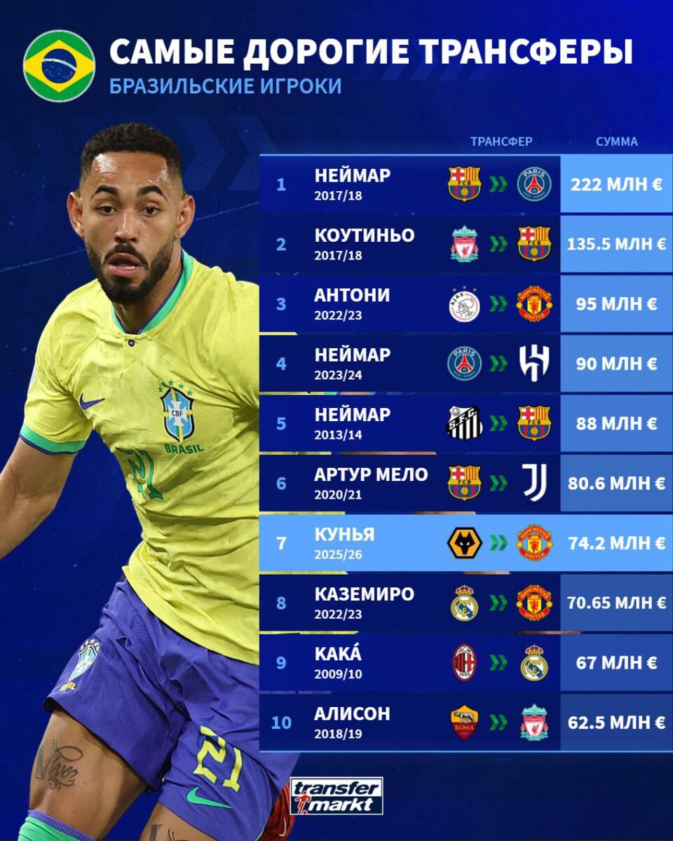 Переход Матеуса Куньи в Манчестер Юнайтед вошёл в топ-10 самых дорогих трансферов бразильских игроков в истории Но, конечно, ему далеко до Неймара. Нею принадлежит не только рекордный трансфер, но и аж три попадания в топ-10 крупнейших трансферов бразильцев!